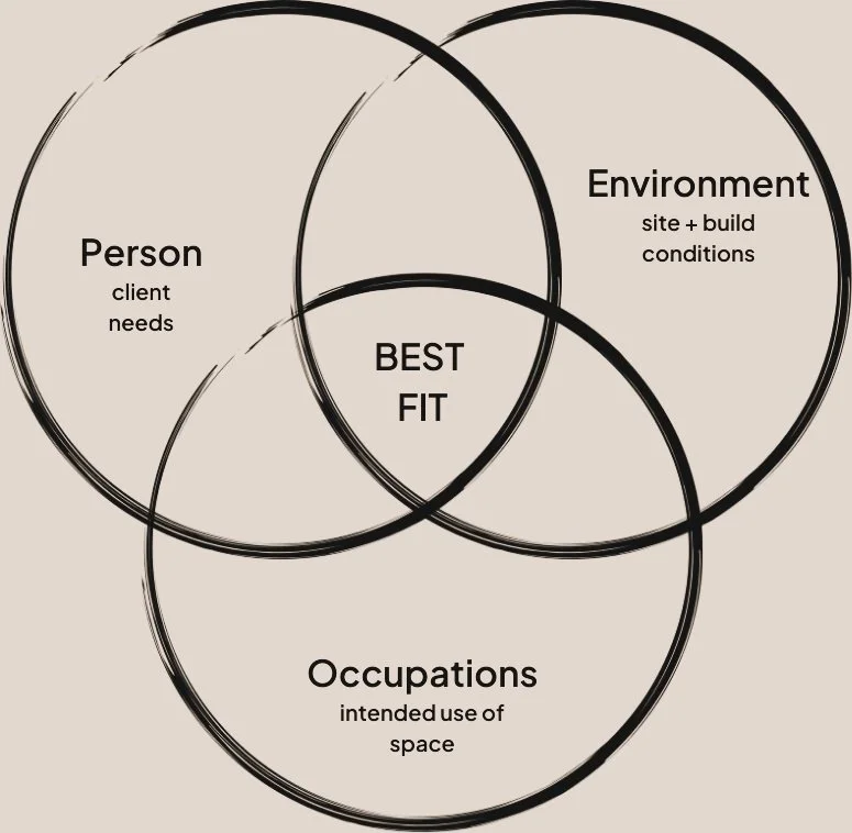 Drawing on an Occupational Therapy background and the Person-Environment-Occupation (PEO) framework, we focus on understanding the best fit for you. This approach ensures that every space supports your well-being and enhances your daily life. Rather than providing technical specialties, we offer a comprehensive and collaborative consultancy, working closely with your chosen professionals such as builders, trades, draftsperson, to ensure your space aligns closely with your unique needs.